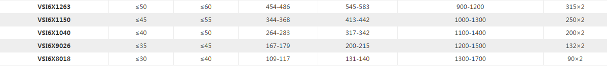 從上面數(shù)據(jù)對比可以看出,ZSJ雙轉(zhuǎn)子制砂機(jī)相比其它制砂機(jī)進(jìn)料粒度是較大的。因此我們在處理物料時可以減少一些破碎設(shè)備的使用,適當(dāng)減少設(shè)備的投資成本、避免過多浪費(fèi)。例如:在處理花崗巖時,相對生產(chǎn)線會使用二臺破碎機(jī)進(jìn)行物料的破碎,而雙轉(zhuǎn)子制砂機(jī)處理只需要使用一臺破碎設(shè)備即可。
