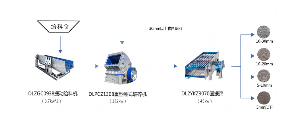 中低硬度物料主機可以選擇錘式破碎機,一次成型,集破碎和整形于一體,初級破碎出一部分成品料,大于30mm以上的物料被返料返送至錘式破碎機中再次破碎,振動篩篩網(wǎng)層級和篩孔尺寸可以根據(jù)客戶對成品料需求進行增減和定制。