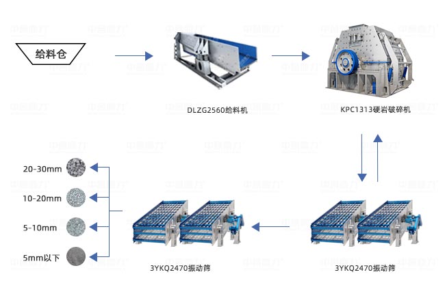設(shè)備配置:DLZGC1250給料機(jī)+DLKPC1313硬巖破碎機(jī)+DL3YKQ2470振動(dòng)篩等。