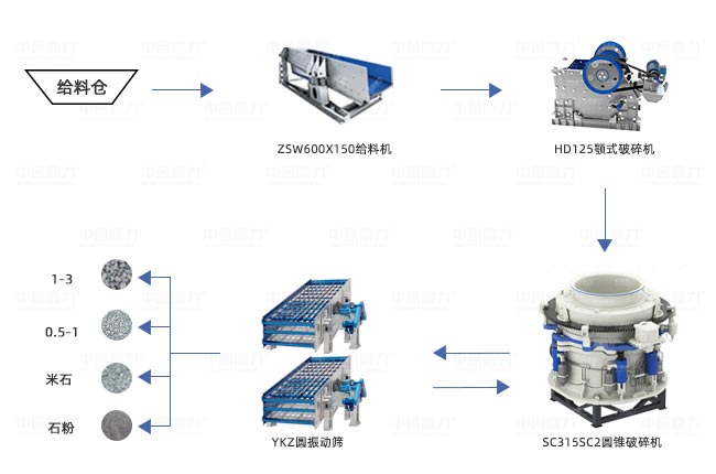 設(shè)備配置:ZSW600X150給料機+HD125顎式破碎機+SC315SC2圓錐破碎機+皮帶機
