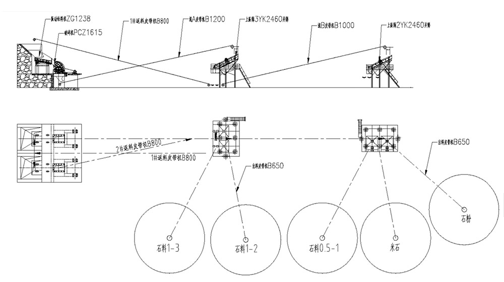 流程描述:大塊石料由DLZG1238振動給料機均勻、連續(xù)的輸送到DLPCZ1615重錘破進(jìn)行粗碎,粗碎后的混合料由1.2米的混料輸送帶送到一臺3YK2460振動篩進(jìn)行篩分,篩分出1-3和1-2兩種成品石子,大于31.5mm的由一條800的返料輸送帶送回到破碎機再次破碎,小于1-2的石料輸送到二道篩再次篩分,篩分出0.5-1石子、米石和石粉三種成品料。