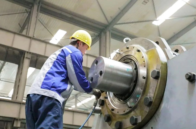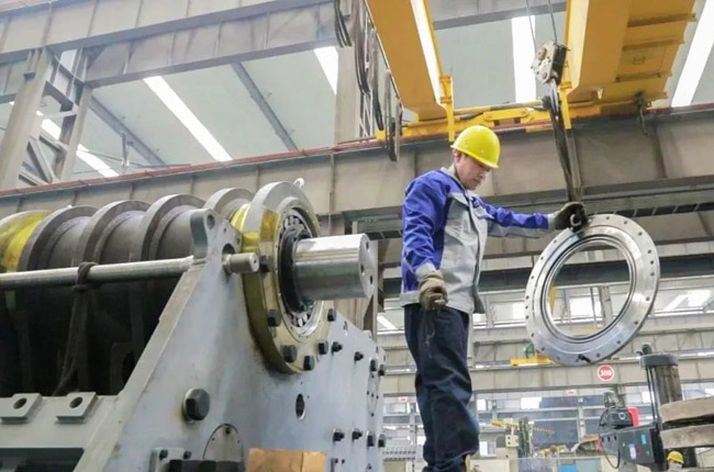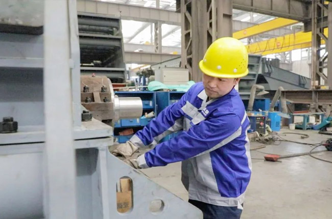 采訪第一事業(yè)部成裝組裝配員工馮浩然的時候,他正在裝配一臺即將發(fā)貨的DLEV125顎式破碎機,從液壓充氣到壓蓋組裝,安裝30個螺絲,只需短短2-3分鐘的時間。用尺子測量軸承間距,進行反復(fù)對比,裝配完成后,對零件的相互位置、配合間隙、松緊情況等進行調(diào)整,然后再進行面的精度檢驗,后進行試運行,面檢查機器運轉(zhuǎn)的靈活性、密封性、轉(zhuǎn)速、功率等各項功能。