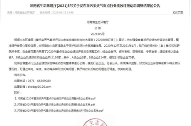 近日,河南省生態(tài)環(huán)境廳公布了《關(guān)于發(fā)布重污染天氣重點行業(yè)績效評級動態(tài)調(diào)整結(jié)果的公告》([2021]5號),河南中譽鼎力智能裝備有限公司成功入選2020年重污染天氣重點行業(yè)績效評級動態(tài)調(diào)整B級企業(yè)名單,并順利通過公示!