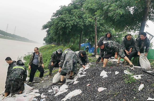 范工和大家一起“扎根”孟姜女河堤,嚴陣以待投入河道防汛救災工作(下圖右一)。他們頂風冒雨,不顧個人安危,搶裝防汛沙袋堵住壩口,一天一夜未眠,盡力守護河堤安。