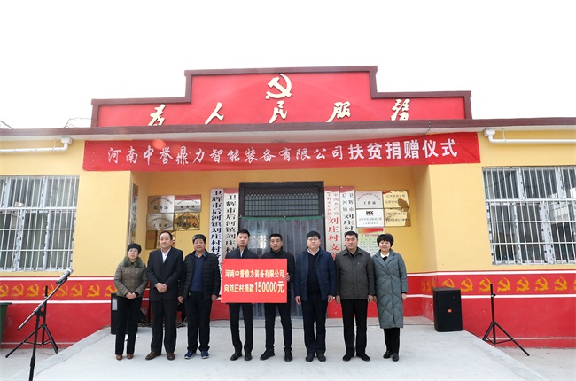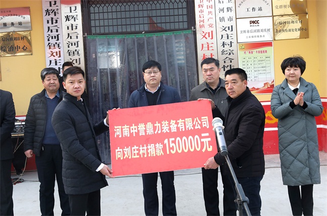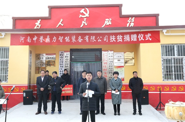 河南中譽(yù)鼎力智能裝備有限公司董事長(zhǎng)張治民發(fā)表講話:“中譽(yù)鼎力作為土生土長(zhǎng)的衛(wèi)輝企業(yè),離不開的關(guān)心和百姓的支持。公司牢記社會(huì)責(zé)任,積響應(yīng)扶貧工作,落實(shí)‘企業(yè)分包貧困村’政策,與后河鎮(zhèn)劉莊村結(jié)對(duì)幫扶。經(jīng)公司研究決定,河南中譽(yù)鼎力智能裝備有限公司此次向劉莊村捐款15萬(wàn)元,主要用于劉莊村的基礎(chǔ)設(shè)施建設(shè)。”