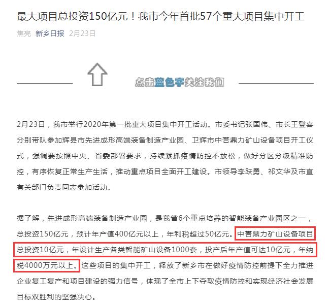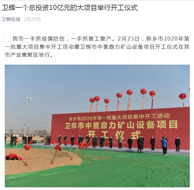 報道鏈接:【資訊】投資10億,衛(wèi)輝市中譽(yù)鼎力礦山設(shè)備項目正式開工!