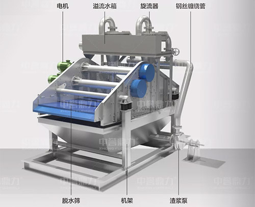 中譽(yù)鼎力細(xì)砂回收脫水一體機(jī)由旋流器、溢流水箱、鋼絲纏繞管、電機(jī)、脫水篩、機(jī)架、渣漿泵等組成,在工作時,渣漿泵將篩水混合物輸送到旋流器中,細(xì)砂經(jīng)沉沙嘴進(jìn)入到下方的脫水篩中,經(jīng)脫水篩脫水后,細(xì)砂與水實現(xiàn)分離,剩余的少量細(xì)砂和泥等雜質(zhì),經(jīng)過溢流水箱進(jìn)入污水處理系統(tǒng),沉淀后進(jìn)行水資源再次利用。