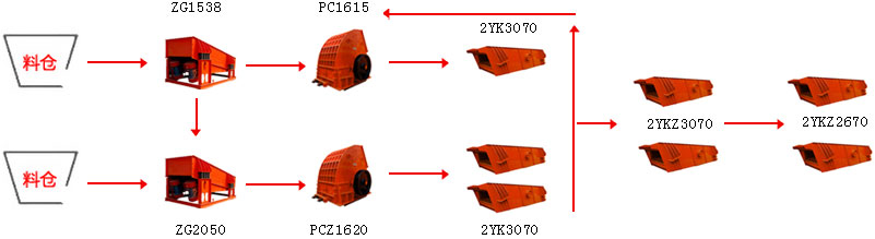 從山上爆破下來的石灰石石料,通過自卸車將1200mm以下的石料送入振動給料機(jī),振動給料機(jī)把石料均勻的送入重錘式破碎機(jī),重錘破對石料進(jìn)行段破碎,從重錘破出來的大塊物料再送入下段錘破進(jìn)行二次破碎整形。通過圓振動篩分級篩分后,粒度不合要求的大塊物料通過輸送帶回到二段錘破重新破碎,成品由皮帶輸送機(jī)輸送至成品區(qū)。 石灰石抗壓強(qiáng)度一般在150兆帕左右,屬于軟巖,因此石灰石生產(chǎn)線的生產(chǎn)工藝選擇上,采用兩臺重型錘式破碎機(jī)組成的兩段一閉路工藝是一種既經(jīng)濟(jì)又合理的選擇。