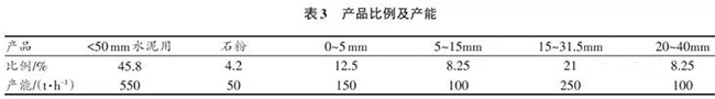 利用自有石灰石礦用配套投建年產(chǎn)百萬噸碎石生產(chǎn)線采取的重錘式破碎機+整形錘式破碎機,在不思考單獨制砂的情景下,產(chǎn)品份額及處理量見表3。