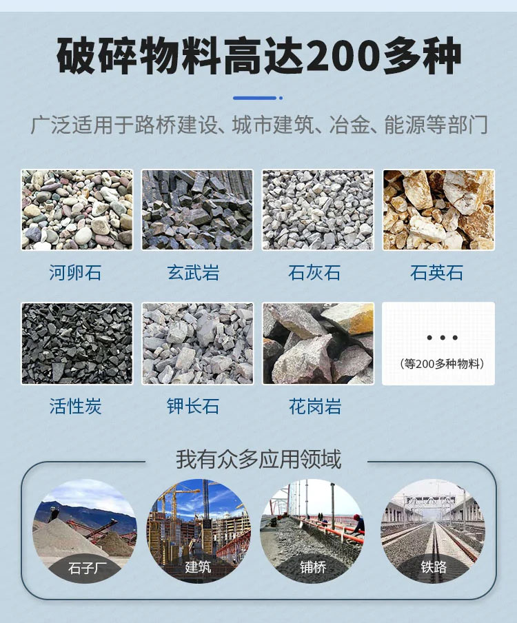 | 適應(yīng)物料: | 石灰?guī)r、輝綠巖、花崗巖、大理石、玄武巖、河卵石、鐵礦石等 |
