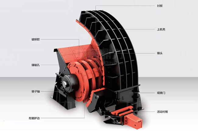 重型錘式破碎機(jī)的結(jié)構(gòu)是由破碎腔、錘軸孔、錘頭、襯板、上機(jī)殼、護(hù)邊、觀察門、轉(zhuǎn)子軸、活動(dòng)襯板等部件組成的。