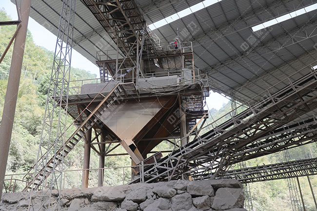 中轉(zhuǎn)料倉通過儲存粗碎后的原料可均衡骨料加工線整體的系統(tǒng)能力,粗破工段檢修時,下游的骨料加工工段不會因此停產(chǎn),可減少停工損失,中轉(zhuǎn)料倉頂部設(shè)置防雨棚,底部預(yù)留排水孔,可進(jìn)入二級破碎階段原料的含水率,是采用干法加工時,能有限成品含粉量,減少石粉粘結(jié)堵塞篩網(wǎng)、溜槽、溜管。中轉(zhuǎn)料倉盡量借助地勢,提高儲量。