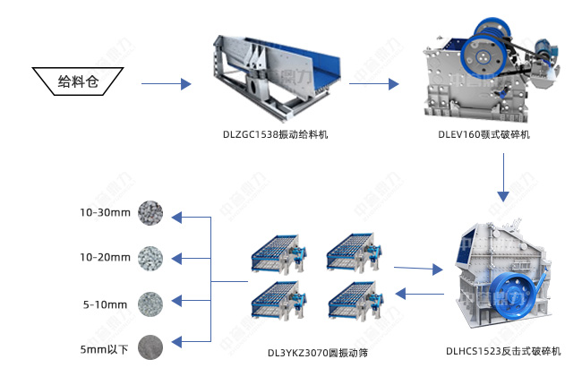 設(shè)備配置:DLZGC1538振動(dòng)給料機(jī)、DLEV160顎式破碎機(jī)、DLHCS1523反擊式破碎機(jī)、4臺(tái)DL3YKZ3070圓振動(dòng)篩、輸送帶