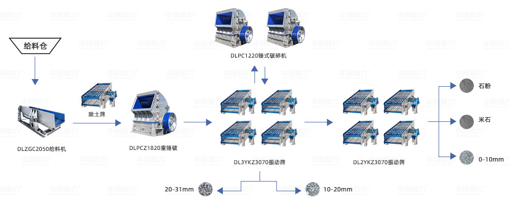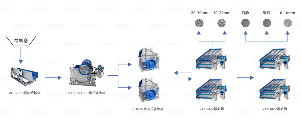 原料倉+ZGC2050振動(dòng)給料機(jī)+PE1500×1800顎式破碎機(jī)+PF1820反擊式破碎機(jī)*2臺(tái)+2YK3072振動(dòng)篩*4臺(tái)。