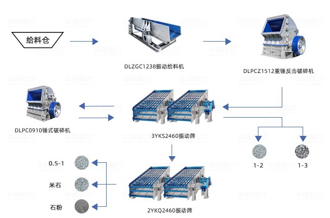 設(shè)備配置:DLZGC1238給料機(jī)+DLPCZ1512重錘破+PC1216破碎機(jī)+YKS系列振動(dòng)篩等。