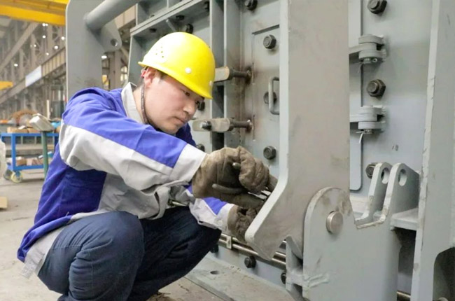 采訪第一事業(yè)部成裝組裝配員工馮浩然的時候,他正在裝配一臺即將發(fā)貨的DLEV125顎式破碎機,從液壓充氣到壓蓋組裝,安裝30個螺絲,只需短短2-3分鐘的時間。用尺子測量軸承間距,進行反復(fù)對比,裝配完成后,對零件的相互位置、配合間隙、松緊情況等進行調(diào)整,然后再進行面的精度檢驗,后進行試運行,面檢查機器運轉(zhuǎn)的靈活性、密封性、轉(zhuǎn)速、功率等各項功能。