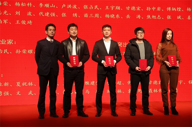 中譽(yù)鼎力智能裝備有限公司董事長(zhǎng)張治民(中)上臺(tái)取“青年企業(yè)家”證書