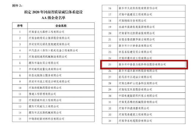 近日,新鄉(xiāng)市中譽(yù)鼎力軟件科技股份有限公司通過初審、用戶滿意度調(diào)查、評(píng)估等程序,成功入選“2020年河南省質(zhì)量誠信體系建設(shè)AA級(jí)企業(yè)”名單。