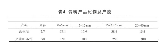 單獨計算骨料生產(chǎn)線各個產(chǎn)品所占份額及處理量見表4。